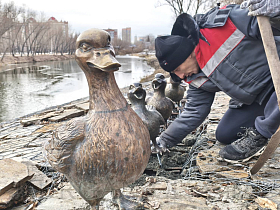 - Мы решили поддержать эту тему. Сначала установили на берегу домики для уток. Затем на входе в парк у нас появилась одна большая мама утка. А сегодня к нам прилетела целая утиная стая. Это четверо маленьких утят. Они все разнохарактерные и веселые, с хорошим позитивным настроением будут встречать гостей нашего парка, жителей нашего города», - рассказала Алла Мирская.