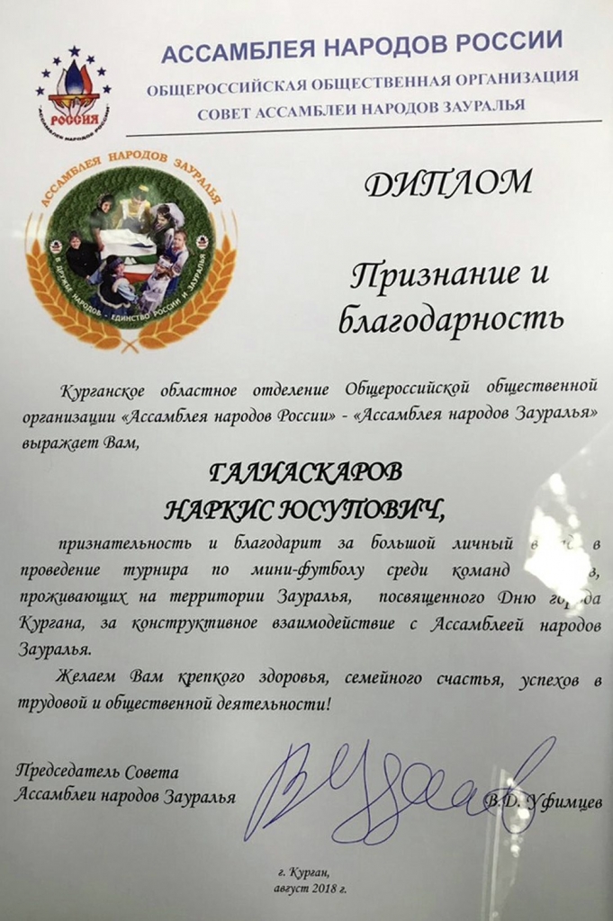 Турнир по мини-футболу среди команд национальных общин Зауралья прошел на футбольном поле школы № 7 в Заозерном жилом массиве. В рамках церемонии награждения Наркис Юсупович был отмечен дипломом за большой личный вклад в проведение турнира, посвященного Дню города, и конструктивное взаимодействие с Ассамблеей народов Зауралья.