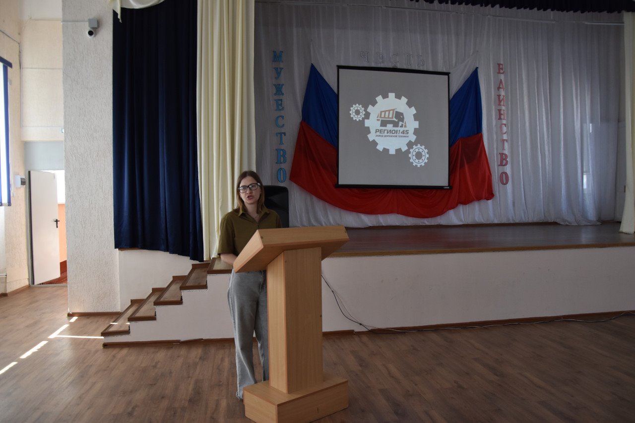 Перед учениками 7-х и 11-х классов школы выступил представитель завода дорожной техники «Регион 45». Докладчик рассказала школьникам о работе предприятия, о количестве сотрудников и их основных задачах, о специальностях, которые необходимо получить для дальнейшего трудоустройства на завод. Работающий на территории города завод прошел немалый путь и приобрел богатый опыт в сфере производства дорожной специализированной техники. Предприятие активно развивается, и модельный ряд выпускаемой продукции постоянно пополняется новыми машинами для строительных, дорожных и коммунальных работ.