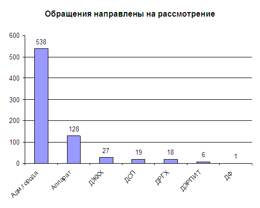 Из 737 обращений – 128 (17%) рассмотрено депутатами городской Думы и специалистами аппарата Главы города и Курганской городской Думы. В соответствии с Федеральным законом от 02.05.2006 г. № 59-ФЗ «О порядке рассмотрения обращений граждан в Российской Федерации» и в связи с разделением полномочий 538 (73%) обращений направлены на рассмотрение в Администрацию города Кургана, 10% обращений направлены в Департаменты Администрации города (см. диаграмма 2).
