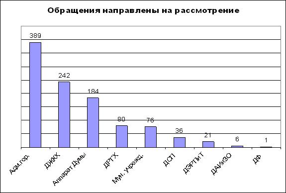 Из 1035 обращений – 184 (18%) рассмотрено депутатами городской Думы и специалистами аппарата Главы города и Курганской городской Думы. В соответствии с Федеральным законом от 02.05.2006 г. № 59-ФЗ «О порядке рассмотрения обращений граждан в Российской Федерации» 389 (38%) обращений направлены на рассмотрение в Администрацию города Кургана, 37% обращений направлены в Департаменты Администрации города, 7% обращений направлены в муниципальные учреждения (диаграмма 2).